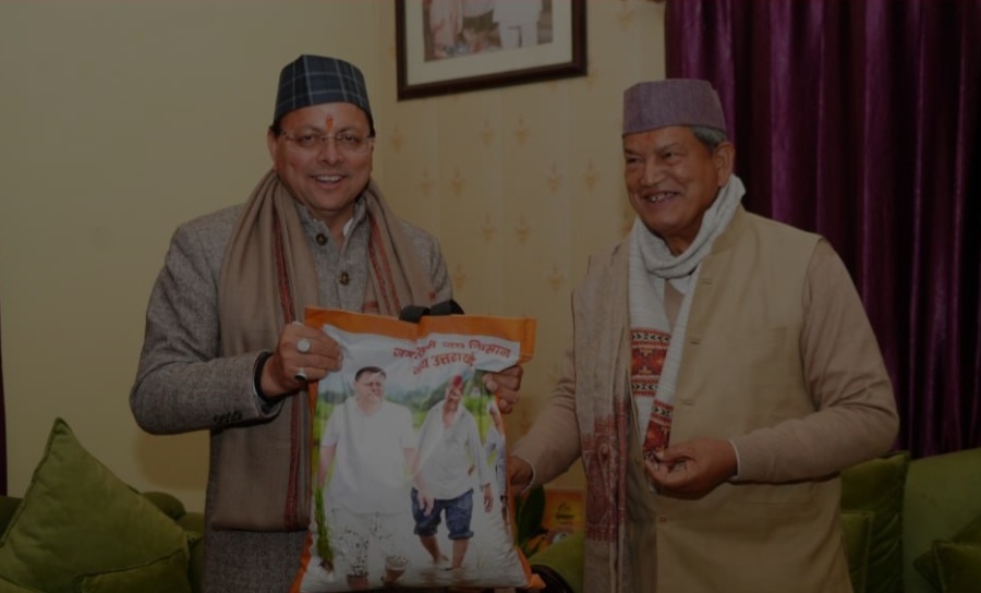 मुख्यमंत्री धामी ने पूर्व सीएम हरीश रावत से की भेंट, अपने खेत में उत्पादित चावल किए भेंट